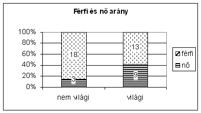 A megkérdezettek közel háromnegyede férfi. Az egyházi állapotot figyelembe véve, a világiak között is csupán 40%-ot ér el a nők aránya. Ismerve a magyar helyzetet (a férfi/nő arány közel 1:1), igen alacsonynak tűnik. Ha a jogi pálya elnőiesedését tekintjük, ez a százalék messze elmarad a civil átlagtól. Kívánatos volna, ha a világiak közel fele nő lenne.