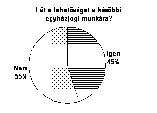 A kérdés megfogalmazásában tudatosan használtam a „lehetőség” és a „kapni” szavakat. Ezt azzal a céllal tettem, hogy a válaszadás előtt mérlegeljék van-e reális esélyük bírósági hivatal betöltésére. Az igen-nem arány 55-45% a válaszoló hallgatók között a nem javára. Még rosszabb a helyzet, ha mindezt az életállapot összefüggésében vizsgáljuk. Az igennel válaszolóknak csupán 26%-a világi. Ebből is látható mennyivel kevesebb lehetőséget látnak a világiak végzettségük egyházon belüli felhasználására. Az igennel válaszoló öt világi férfi-nő aránya 4:1. Mindezt vessük össze azzal, hogy 9 világi nő töltötte ki a kérdőíveket!