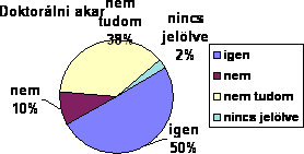 A változás jelentős a licenciához képest. Doktorálni 50% akar, a „nem tudom” (bizonytalan), esetleg a licenciátus eredményétől teszi (az intézet is teheti) függővé. A határozottan nemmel válaszolók százaléka a duplájára emelkedett a licenciátust nem akarókhoz képest. Licenciázni harminchatan akarnak, doktorálni huszonegyen. A férfiak aránya a licenciázók között: 72%, a doktorálni szándékozók már 81%. Az eltolódása jelentős (10%). Ha a világiak nem világiak arányát nézzük, a licenciázók között 56%, a doktorálni szándékozók közül 62% a nem világi.